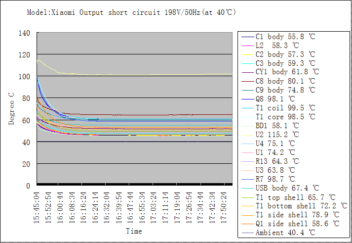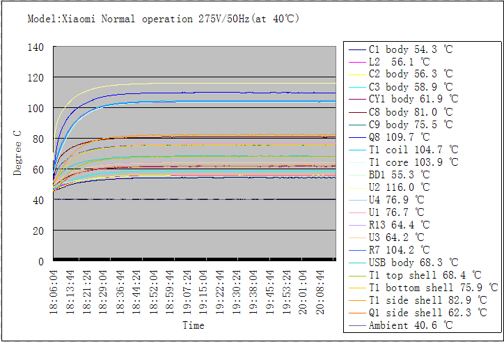 概要:在無風高溫環(huán)境下評測產(chǎn)品殼體溫度、USB連接部位金屬件溫度、大電解電容溫度頂部/中部/底部溫度,變壓器溫度、功率電阻溫度等,散熱效果不好,代表產(chǎn)品溫度高、發(fā)燙,炸機概率增大。