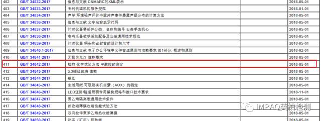 2017年11月1日,國家質(zhì)檢總局、國家標(biāo)準(zhǔn)委發(fā)布了2017年第29號公告,批準(zhǔn)發(fā)布了585項(xiàng)國家標(biāo)準(zhǔn)和2項(xiàng)國家標(biāo)準(zhǔn)修改單。其中,GB/T 34842-2017《鞋類 化學(xué)試驗(yàn)方法 甲酰胺的測定》標(biāo)準(zhǔn)位列其中(第411號),該標(biāo)準(zhǔn)即將于2018年5月1日實(shí)施。