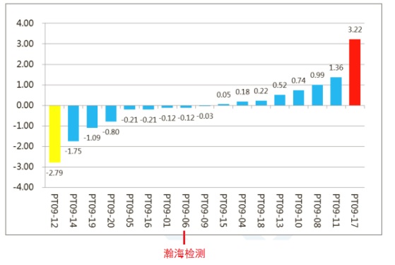 參與的17家單位,獲得滿意結(jié)果的有15家。瀚海檢測以過硬的測試能力獲得較高的成績,通過了本次能力驗證。參加單位的Z比分數(shù)柱狀圖如下:(瀚海檢測為PT09-06)