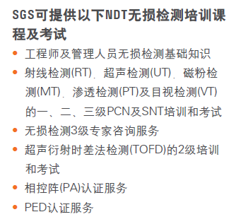SGS目前在中國(guó)提供的培訓(xùn)和考試時(shí)基于最高標(biāo)準(zhǔn)的歐標(biāo),國(guó)際標(biāo)準(zhǔn)以及美標(biāo)(EN ISO 9712/SNT-TC-1A)實(shí)施,特別注重培訓(xùn)各種常規(guī)無損檢測(cè)方法的全名應(yīng)用。學(xué)員通過考試后將被授予英國(guó)無損檢測(cè)協(xié)會(huì)(BINDT)頒發(fā)的個(gè)人無損檢測(cè)資質(zhì)證書(PCN)。