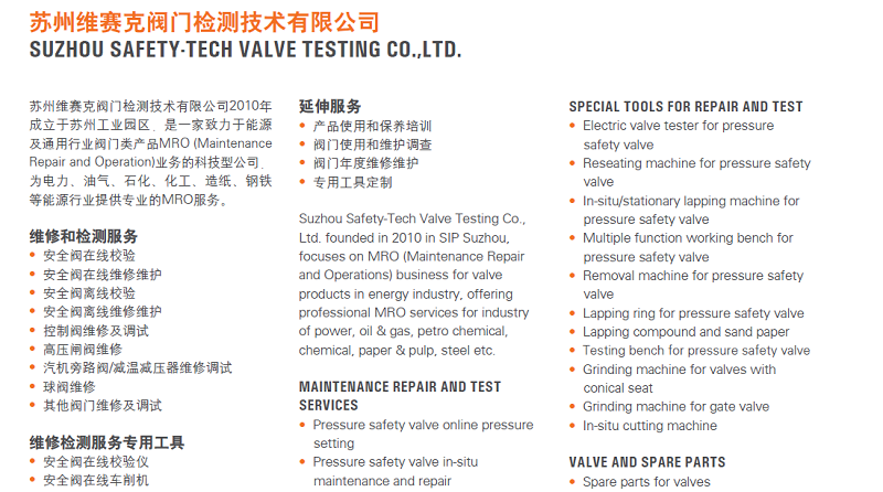 SGS下屬子公司蘇州維賽克閥門(mén)檢測(cè)技術(shù)有限公司是一家致力于能源及通用行業(yè)閥門(mén)類(lèi)產(chǎn)品MRO(Maintenance Repair and Operation)業(yè)務(wù)的科技型公司,為電力、汽油、石化、化工、造紙、鋼鐵等能源行業(yè)提供專(zhuān)業(yè)的MRO服務(wù)。維修和檢測(cè)服務(wù)包括:安全閥在線校驗(yàn);安全閥在線維修維護(hù);安全閥離線校驗(yàn);安全閥離線維修維護(hù);控制閥維修及調(diào)試;高壓閘閥維修;汽機(jī)旁路閥/減溫減壓器維修調(diào)試;球閥維修;其它閥門(mén)維修及調(diào)試。