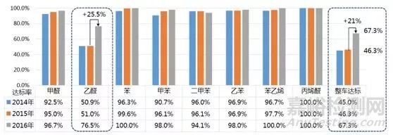 2014年至2016年三年時間內(nèi),以GB/T27630-2011作為判定依據(jù),整車達(dá)標(biāo)率約增長22%,但是2016年的車內(nèi)空氣達(dá)標(biāo)率依舊只有67.3%,若以即將實施的強(qiáng)標(biāo)GB 27630-201X作為判定依據(jù),達(dá)標(biāo)率為82.4%,主機(jī)廠車內(nèi)空氣達(dá)標(biāo)仍存在較大壓力,車內(nèi)空氣質(zhì)量改善任重而道遠(yuǎn)。