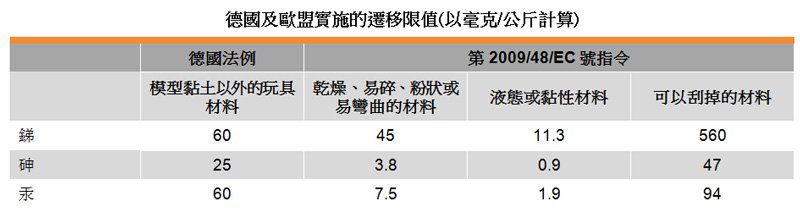 德國(guó)現(xiàn)時(shí)實(shí)施的限值是以生物可用率表述,即是玩具釋出并可能被人體吸收的化學(xué)物質(zhì)份量。德國(guó)采用的限值適用于所有材料。