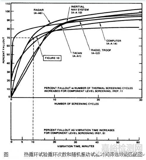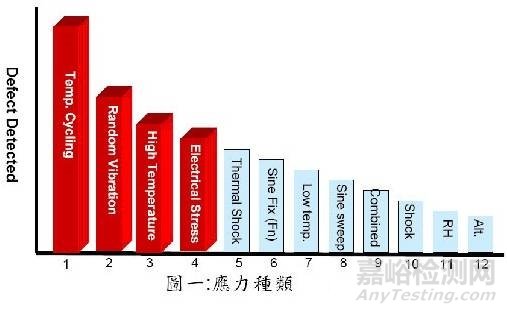 熱試驗的目的也有兩大方面:一為普遍都知道的環(huán)境適應(yīng)性,二為考核工藝質(zhì)量(workmanship)。從圖1中可以看出,溫度循環(huán)或熱循環(huán)試驗在環(huán)境應(yīng)力篩選(ESS)的效能中排第一位。ESS的目的就是考核工藝質(zhì)量、剔除早期失效。因此,熱試驗的溫度范圍應(yīng)該至少為ESS量級范圍。