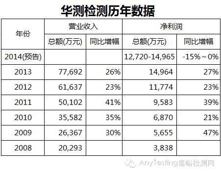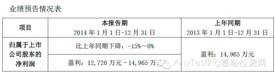 2015年1月29日,國內檢測業(yè)上市公司華測檢測發(fā)布2014年度業(yè)績預告。預告顯示,2014年華測檢測凈利潤預計比2013年下降15%~0%,這是該公司自2009年上市以來首次出現(xiàn)凈利潤負增長。
