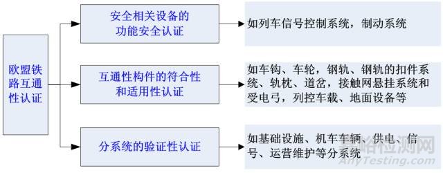 歐盟鐵路針對構(gòu)件及分系統(tǒng)建立了不同類型的互通性認證制度(簡稱“TSI認證”),要求互通性構(gòu)件投入市場前、分系統(tǒng)投入運營前均需認證,這種互通性認證包括3個方面: