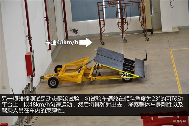 動(dòng)態(tài)翻滾試驗(yàn)檢測(cè)目的是車(chē)頂結(jié)構(gòu)強(qiáng)度和防止乘員拋出的性能。試驗(yàn)車(chē)輛放在傾斜角度為23°的可移動(dòng)平臺(tái)上,以48km/h勻速運(yùn)動(dòng),減速距離不超過(guò)3英尺,并且在平臺(tái)減速和汽車(chē)起步過(guò)程中,沒(méi)有橫向移動(dòng)或轉(zhuǎn)動(dòng),減速度不小于20g,持續(xù)時(shí)間不短于4ms。