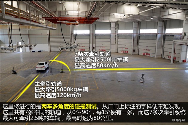 車(chē)對(duì)車(chē)碰撞試驗(yàn)檢測(cè)目的是兩車(chē)相撞時(shí)車(chē)輛對(duì)雙方乘員保護(hù)的能力(車(chē)輛相容性)。相對(duì)常規(guī)壁障碰撞試驗(yàn)而言,實(shí)車(chē)對(duì)碰能夠更真實(shí)的復(fù)現(xiàn)交通事故場(chǎng)景,可為現(xiàn)代車(chē)輛相容性的研究積累大量有效數(shù)據(jù)。共設(shè)計(jì)有七條軌道,軌道角度分別為0°、15°、30°、45°、60°、75°、90°,可模擬多種試驗(yàn)效果。碰撞大廳設(shè)有高速攝像地坑,根據(jù)錄像可觀測(cè)碰撞時(shí)車(chē)輛底盤(pán)的運(yùn)動(dòng)情況,同時(shí)結(jié)合采集的各類(lèi)傳感器數(shù)據(jù)可對(duì)車(chē)輛性能進(jìn)行全面分析。此試驗(yàn)?zāi)芰?duì)提升車(chē)輛安全性能設(shè)計(jì)水平有重大意義。