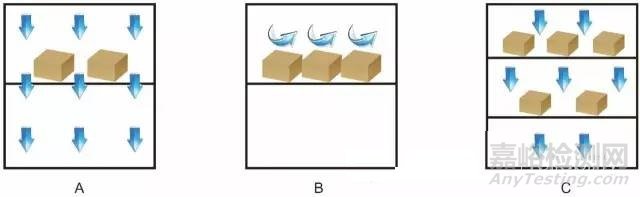 試驗(yàn)樣品在試驗(yàn)箱內(nèi)的擺放以不影響試驗(yàn)箱內(nèi)的空氣對(duì)流為原則,可以多層擺放。下圖是幾個(gè)擺放示意圖,其中A和C是正確的擺放方式,B擺放方式會(huì)影響試驗(yàn)箱內(nèi)的空氣對(duì)流,不推薦。