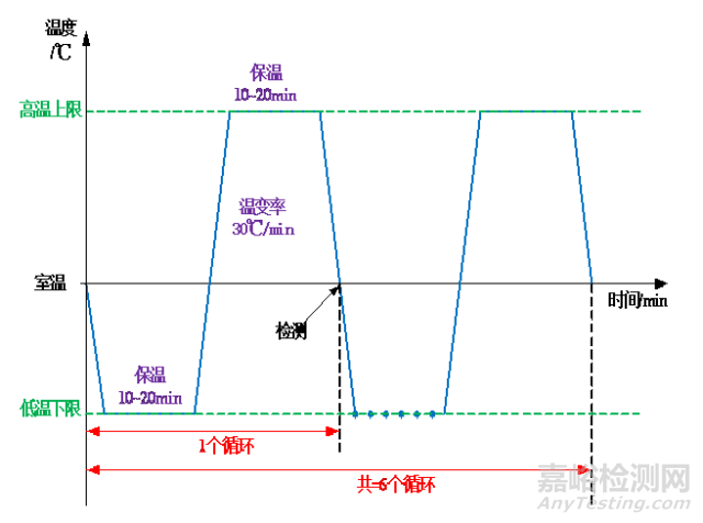 一個(gè)完整的快速溫變循環(huán)包括從室溫開始、下降、低溫下限保溫、上升、高溫上限保溫、下降、到室溫停止、最后檢測(cè)。