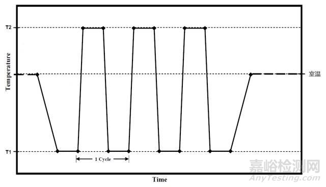 對(duì)于溫度沖擊循環(huán)次數(shù)的定義是經(jīng)歷過(guò)從高溫到低溫各一次的溫度沖擊,再加上在高溫和低溫各經(jīng)歷過(guò)相應(yīng)保持時(shí)間的試驗(yàn),具體如下圖。