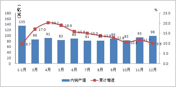 2014年,我國集成電路產業(yè)完成內銷產值1011億元,同比增長9.9%,高于全行業(yè)增速1.2個百分點,內銷比例達到34.7%,比上年提高0.4個百分點。從全年走勢看,內銷產值增速呈下降態(tài)勢,全年增速低于上半年5.9個百分點。