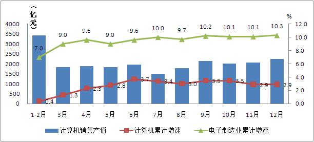 2014年,我國累計(jì)生產(chǎn)微型計(jì)算機(jī)3.51億臺(tái),下滑0.8%;其中筆記本電腦2.27億臺(tái),下降5.5%。計(jì)算機(jī)全行業(yè)實(shí)現(xiàn)銷售產(chǎn)值22729億元,同比增長2.9%,低于電子信息制造業(yè)全行業(yè)增速7.4個(gè)百分點(diǎn),低于上年2.6個(gè)百分點(diǎn)。