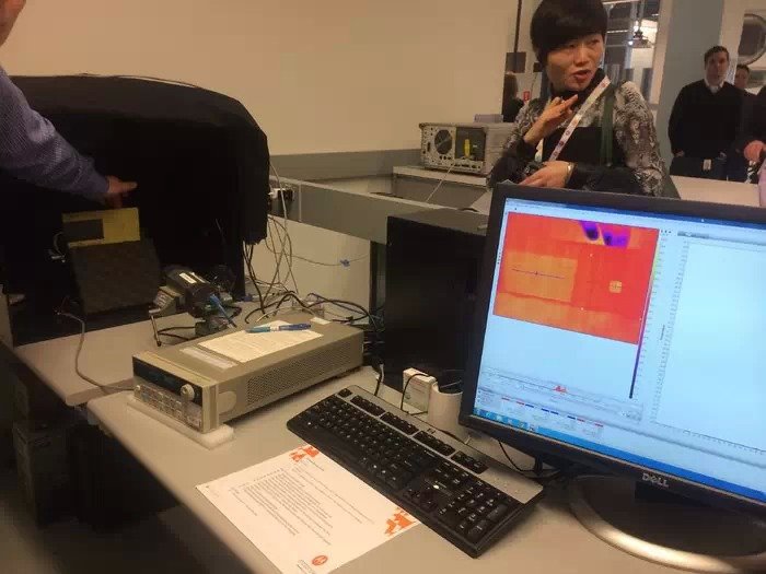在加熱器旁邊,是用來測量溫度的熱成像儀。把電源打開就可以看到,右邊只有芯片的部分溫度升高很快,而左邊附有特殊材料的部分溫度升高要先對慢一些。不僅溫度低一點(diǎn)的芯片散熱也更好,而且,當(dāng)把電源關(guān)掉的時(shí)候,它的溫度冷卻還很快,這意味著這種材料表現(xiàn)很好。