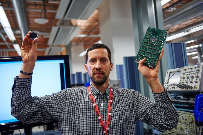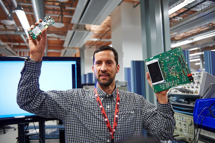 工程設(shè)計(jì)主管馬特告訴我們,所謂的參考設(shè)計(jì)是把新的一些創(chuàng)意制作成一種雛形。他和他的團(tuán)隊(duì)會(huì)一起把參考設(shè)計(jì)和其他前沿化需求做到參考電路板上。然后再根據(jù)實(shí)際效果,最終縮小很多倍,變成實(shí)際安裝在手機(jī)里的電路板??梢钥吹剑瑓⒖茧娐钒搴蛯?shí)際的成品之間,大小差異非常的大。下圖里分別是Moto G和Moto 360的參考電路板和實(shí)際電路板的對比。