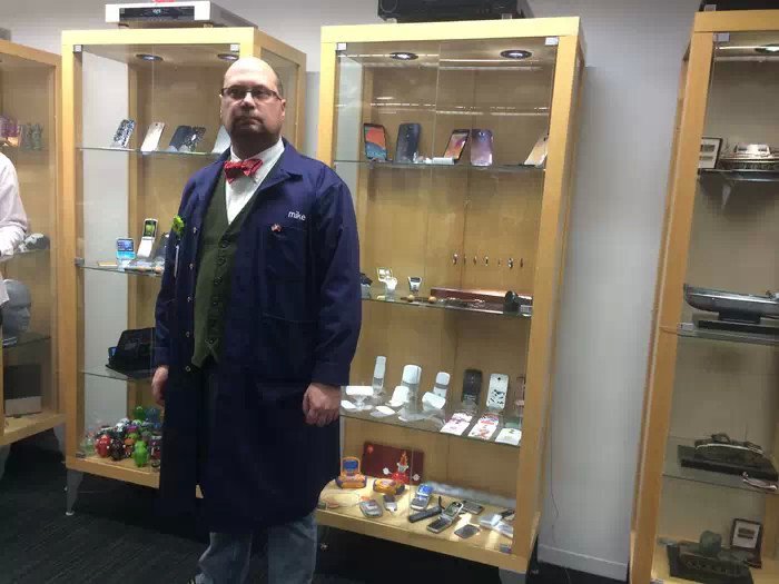 邁克負(fù)責(zé)所有產(chǎn)品的模具的安排和管理。這個(gè)實(shí)驗(yàn)室里的人都有自己藍(lán)色的工作服,背后印著“Motorola”的標(biāo)識(shí),前面則是他的名字。胖胖的邁克是個(gè)光頭,再加上他戴著的紅色領(lǐng)結(jié),看起來覺得有點(diǎn)像柯南里的阿笠博士。