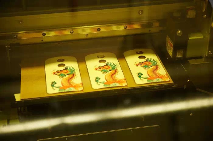另外一個(gè)是數(shù)碼打印機(jī),在手機(jī)上打印不同的圖案。因?yàn)楣こ處熤牢覀円獊?,所以剛好在打印一條龍。這些機(jī)器都是24小時(shí)*7天不停歇地運(yùn)轉(zhuǎn)。
