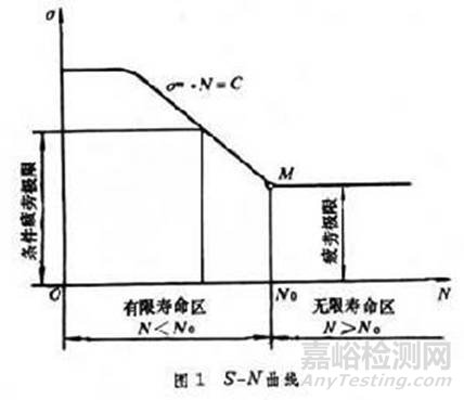 根據(jù)零件所用材料的試樣的疲勞試驗結(jié)果,以最大應(yīng)力σ為縱坐標(biāo)、以達(dá)到疲勞破壞的循環(huán)數(shù) N為橫坐標(biāo),畫出一組試樣在某一循環(huán)特征下的應(yīng)力-壽命曲線(σ-N曲線)。應(yīng)力-壽命曲線和應(yīng)變-壽命曲線統(tǒng)稱為S-N 曲線(圖1)。曲線的斜線部分的一般表達(dá)式為:σmN=C,式中m和C為材料常數(shù)。在應(yīng)力和循環(huán)數(shù)的雙對數(shù)坐標(biāo)中,該方程式的圖形是一條直線。