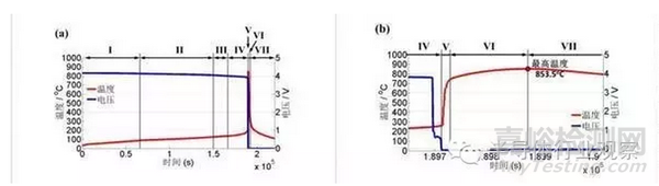 大量實驗現(xiàn)象表明,熱失控后的電池不一定會同時發(fā)生冒煙、起火與爆炸,也可能都不發(fā)生,這取決于電池材料發(fā)生熱失控的機理。下圖展示了某款具有三元正極/PE基質的陶瓷隔膜/石墨負極的鋰離子動力電池的熱失控機理。該款鋰離子動力電池絕熱熱失控實驗中的溫度與電壓曲線,根據(jù)其熱失控溫度變化的特征,將熱失控過程分為了7個階段。在不同階段,電池材料發(fā)生不同的變化,通過一系列的圖片解釋了各個階段電池材料的變化情況。