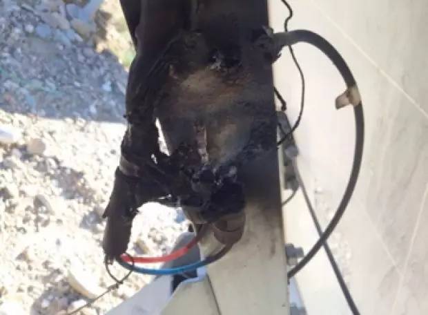而在失效的樣品中就有兩個是用了不同的電纜,且外徑相差懸殊。圖中的左側(cè)圖連接器一側(cè)用的是光伏電纜(黑色),外徑為6mm,而另一側(cè)則是用的 普通線纜(藍色),外徑僅為4mm。將藍色電纜端的螺帽擰開后發(fā)現(xiàn)可能由于密封不夠竟采用了紅色塑料片填充。在該種情況下連接器是很難保證其密封性,因此,在戶外應(yīng)用時有可能會進水進塵,從而破壞絕緣性能,進而引發(fā)火災(zāi)。