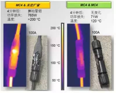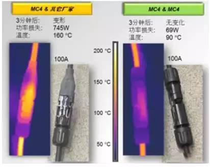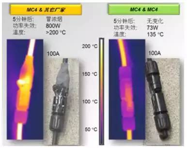 而與之形成鮮明對比的是MC4自身公母頭插合后的測試結(jié)果:除了溫度有初始的90℃升高到135℃及功率損失由69W升高到73W外,外觀并無明顯的變化。