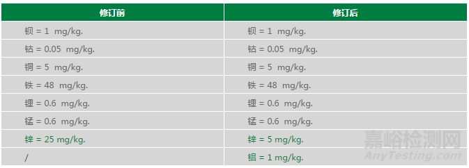 更新為8項(xiàng)重金屬(鋁、鋇、鈷、銅、鐵、鋰、錳、鋅) 其中鋁的限值為1mg/kg; 鋅的限值由25mg/kg改為5mg/kg。 |