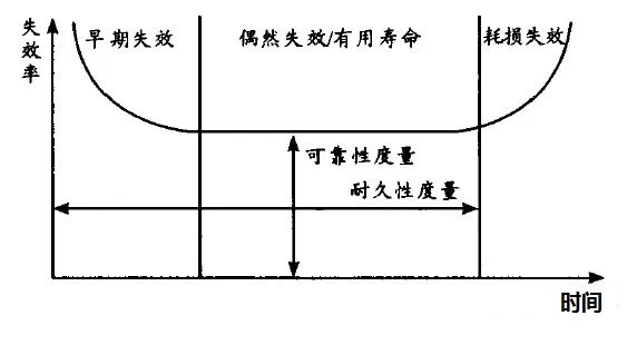 4.耐久性與可靠性的度量方式不同。耐久性由耗損前的壽命來度量,而可靠性以工作壽命(有用壽命)和偶然失效數(shù)來量度。兩者的區(qū)別可用產(chǎn)品的失效率和失效時間的關系曲線(浴盆曲線)來描述。