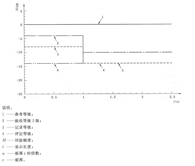 c)接著根據(jù)缺欠回波波幅H(dB)以及缺欠顯示長(zhǎng)度l 與板厚t之間的倍數(shù)n(n等于缺欠顯示長(zhǎng)度除以板厚),確定驗(yàn)收等級(jí)、記錄等級(jí)。