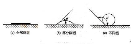 (a)θ=0°,全部潤(rùn)濕;(b)θ<90°,部分潤(rùn)濕;(c)θ>90°,不潤(rùn)濕。