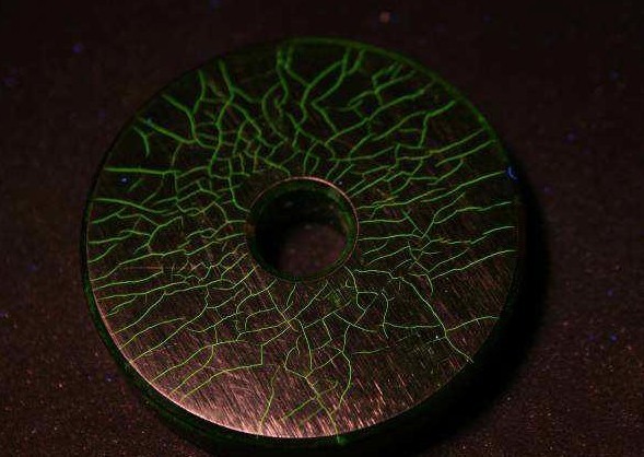 肉眼無(wú)法察覺(jué)的微裂紋,經(jīng)熒光滲透檢,在紫外線燈的照射下,黃綠色熒光格外醒目,如下圖所示: