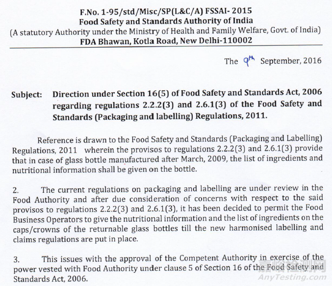 2016年9月9日,印度食品標準和法規(guī)局發(fā)布關(guān)于食品包裝和標簽的解讀,該解讀涉及到《食品安全和標準法案(2006年版)》的16(5)部分和相關(guān)的《食品安全和標準法規(guī)(2011年版)》的2.2.2(3)和2.6.1(3)部分。2009年3月之后生產(chǎn)的玻璃瓶上必須標標注食品的營養(yǎng)信息和配料表,允許食品生產(chǎn)商將營養(yǎng)信息和配料表標注在可重復(fù)利用的玻璃瓶的瓶蓋上,直到有新的食品標簽和聲稱的相關(guān)法規(guī)生效。