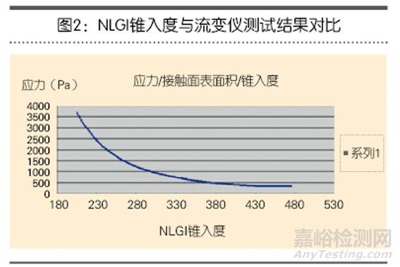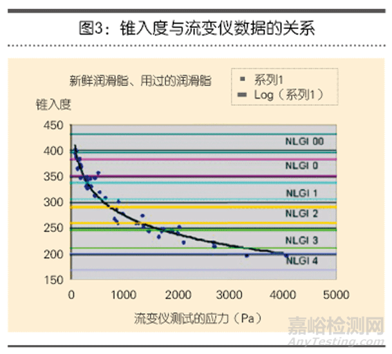 根據流變儀輸出的數據,圖3清楚地顯示了NLGI稠度等級的非線性特質。圖2顯示了兩種測試方法的結果及聯系。表1顯示了各種NLGI等級潤滑脂的應力數據。要注意的是,潤滑脂的稠度越高,其稠度等級下的稠度誤差越大。