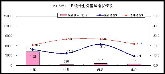 1-2月,西部地區(qū)完成軟件業(yè)務收入597億元,同比增長21.4%,增速高出全國平均水平5.6個百分點,占全國比重上升至10.9%,其中陜西省增速超過30%;東部地區(qū)完成軟件業(yè)務收入4129億元,同比增長16.1%,增速比去年同期下降4.6個百分點,但仍高出全國平均水平0.3個百分點;中部、東北地區(qū)分別完成軟件業(yè)務收入226和517億元,同比增長12.2%和9.3%,增速比去年同期下降14.3和17.2個百分點。