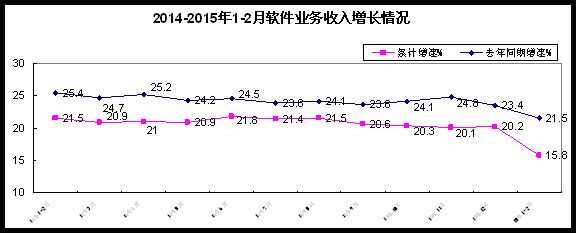 1-2月,我國軟件和信息技術服務業(yè)實現軟件業(yè)務收入5469億元,同比增長15.8%,增速比去年同期和去年底分別下降5.7和4.4個百分點。實現利潤總額578億元,同比增長11.7%,增速低于去年同期11.7個百分點,低于收入增速4.1個百分點。