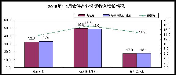 1-2月,軟件產品實現收入1767億元,同比增長13.6%,增速低于去年同期7.2個百分點。其中,信息安全產品增長21.9%,高出全行業(yè)增速6.1個百分點。信息技術服務實現收入2721億元,同比增長17.6%,增速低于去年同期3.7個百分點,占全行業(yè)比重接近一半。其中,運營相關服務(包括在線軟件運營服務、平臺運營服務、基礎設施運營服務等在內的信息技術服務)收入增長19.8%;電子商務平臺服務(包括在線交易平臺服務、在線交易支撐服務在內的信息技術支持服務)收入增長19.5%。集成電路設計實現收入181億元,同比增長16.5%,增速低于去年同期4.7個百分點。嵌入式系統(tǒng)軟件實現收入981億元,同比增長14.9%,增速比去年同期回落8.7個百分點。