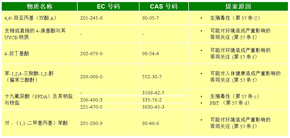下表列出最新建議的6種高度關(guān)注物質(zhì)及其屬性:
