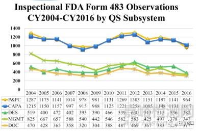 483觀察項方面,根據(jù)上圖所示,自2004年至2016年,F(xiàn)DA醫(yī)療器械工廠審核中,P&PC與CAPA涉及483觀察項基本不相上下,但遠(yuǎn)遠(yuǎn)高于其他幾個子系統(tǒng)涉及的觀察項,具體觀察項數(shù)基本超過其他子系統(tǒng)觀察項的一倍以上。 2016年P(guān)&PC子系統(tǒng)的483觀察項占總數(shù)比例32%,CAPA占比34%。七大子系統(tǒng)中,P&PC與CAPA兩個子系統(tǒng)的483觀察項占了總數(shù)約66%的比例。
