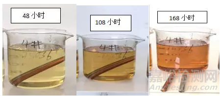 實驗方法:試樣(200ml)在銅棒和鋼棒催化劑同時存在下,于135℃維持168小時。通過對熱穩(wěn)定性試驗后的油樣、銅棒、鋼棒的分析測定(測定指標:黏度變化、中和值變化、銅棒外觀、鐵棒外觀、總沉渣重、銅棒失重等)。