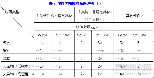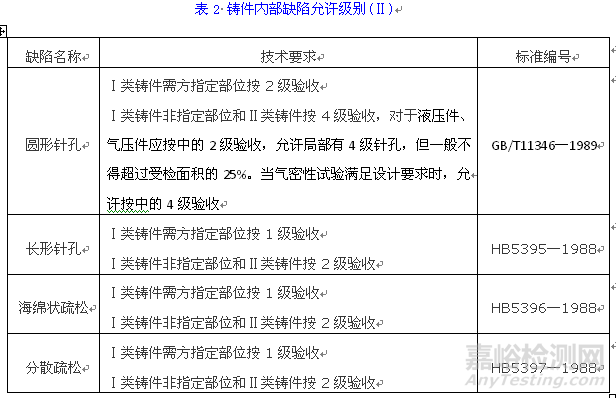 各類鑄件內(nèi)部氣孔、縮孔、疏松、夾雜物缺陷按表2中所規(guī)定的執(zhí)行。