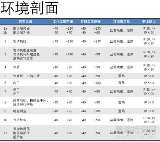 每一家汽車主機(jī)廠都會對汽車不同區(qū)域的溫度上下限有明確的定義,下面就是個(gè)例子。即使自己想不出來也可以參考下ISO 16750系列的標(biāo)準(zhǔn)啊,對于一家全球銷售的汽車企業(yè)這個(gè)都不會還做啥汽車開發(fā)呢。