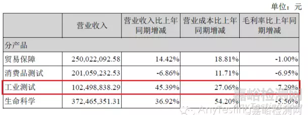 從業(yè)務(wù)單元來(lái)看,工業(yè)測(cè)試領(lǐng)漲,增幅超過(guò)了45%,而其傳統(tǒng)業(yè)務(wù)貿(mào)易保障和消費(fèi)品測(cè)試業(yè)務(wù)增幅均低于公司整體增幅,尤其是消費(fèi)品測(cè)試出現(xiàn)了負(fù)增長(zhǎng)。