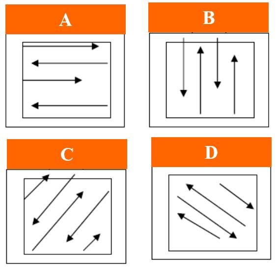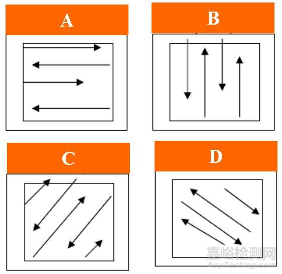 目前在已經(jīng)實施的國家相關(guān)食品標準中,還沒有專門針對食品加工表面取樣方法的標準。我們在進行涂抹取樣時可以參考GB 50591-2010《潔凈室施工及驗收規(guī)范》中關(guān)于表面染菌密度的取樣方法,或者參考在《食品生產(chǎn)經(jīng)營過程中微生物控制指導(dǎo)原則》(征求意見稿)中的采樣方法。其中后者對于采樣方法是如下描述的:用5cm×5cm的標準滅菌規(guī)格板,放在被檢物體表面,采樣面積≥100cm2,連續(xù)采樣4個,用浸有含相應(yīng)中和劑的無菌洗脫液的棉拭子1支,在規(guī)格板內(nèi)橫豎往返均勻涂擦各5次,并隨之轉(zhuǎn)棉拭子,剪去手接觸部位后,將棉拭子投入10ml含相應(yīng)中和劑的無菌洗脫液試管內(nèi)。對于涂抹方式的取樣方法國外也有不同的描述,基本大同小異。例如美國FDA對于干燥表面的取樣推薦的采樣方法是在取樣區(qū)域內(nèi)水平方向涂抹10次,垂直方向涂抹10次,對角線方法再涂抹10次。加拿大對于一般區(qū)域推薦的取樣方法是:以之字方式先按從上到下的方向涂抹整個取樣區(qū)域,再翻轉(zhuǎn)涂抹棒采樣面按從左到右的方向涂抹整個取樣區(qū)域。英國公共衛(wèi)生部門推薦的取樣方法則是按照如下圖的方式涂抹整個取樣區(qū)域30s的時間,這種涂抹方式與美國FDA推薦的類似。