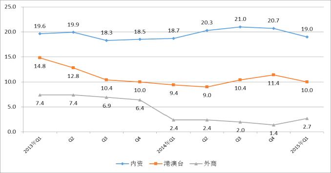 1-3月,內(nèi)資企業(yè)的銷售產(chǎn)值和出口交貨值分別為8904億元和1644億元,同比增長19%和15.5%,分別高出全行業(yè)平均水平9和10.3個百分點。內(nèi)資企業(yè)銷售產(chǎn)值占全國比重持續(xù)擴大,1-3月,內(nèi)資企業(yè)的銷售產(chǎn)值和出口交貨值占全國比重分別為36.7%和14.2%,比1-2月分別上升0.9和0.2個百分點,比去年同期分別上升4.1和1.8個百分點。港澳臺投資企業(yè)實現(xiàn)銷售產(chǎn)值和出口交貨值5878億元和3625億元,分別增長10%和3.4%,低于1-2月增速0.3和2.3個百分點。外商投資企業(yè)增速小幅反彈。2014年9月-2015年2月,外商投資企業(yè)銷售產(chǎn)值增速持續(xù)下滑,增速分別為2%、1.7%、1.5%、1.4%和1.3%,2015年3月,外商投資企業(yè)銷售產(chǎn)值增速首次反彈,同比增長2.7%,高于1-2月增速1.4個百分點,高于去年同期0.3個百分點。外商投資企業(yè)實現(xiàn)出口交貨值6320億元,同比增長3.9%,高于1-2月增速1.9個百分點,高于去年同期4.6個百分點。
