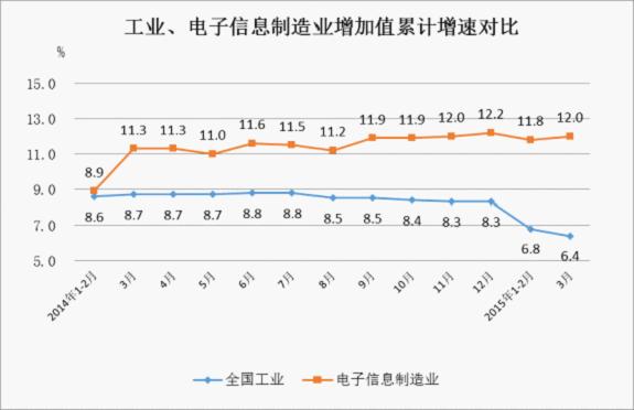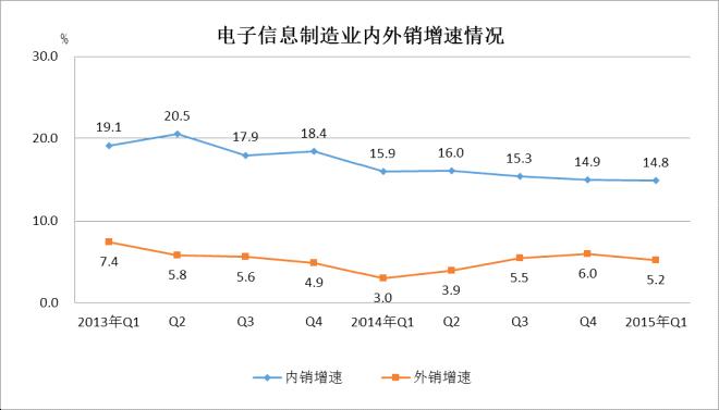 國內(nèi)消費市場的拉動作用逐漸加強,1-3月,規(guī)模以上電子信息制造業(yè)實現(xiàn)內(nèi)銷產(chǎn)值12657億元,同比增長14.8%,高于1-2月增速1.9個百分點,高出全行業(yè)平均增速4.8個百分點。出口交貨值11588億元,同比增長5.2%,低于1-2月0.7個百分點,低于全行業(yè)平均增速4.8個百分點。內(nèi)銷比重逐步擴大,2014年10月-2015年3月,內(nèi)外銷產(chǎn)值比重分別為49.7:50.3、49.7:50.3、49.9:50.1、51.8:48.2、52.2:47.8。