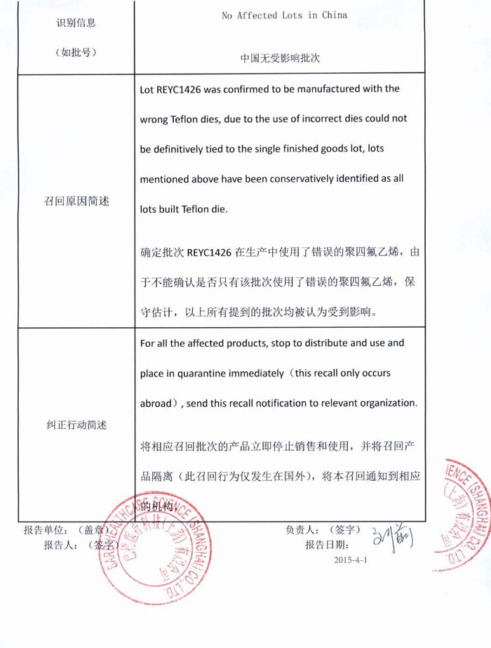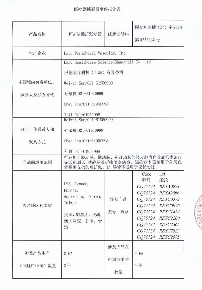 巴德醫(yī)療科技(上海)有限公司報(bào)告,該公司代理的PTA球囊擴(kuò)張導(dǎo)管(商品名:CONQUEST) (注冊(cè)證號(hào):國(guó)食藥監(jiān)械(進(jìn))字2014第3773682號(hào))由于在生產(chǎn)中使用了錯(cuò)誤的聚四氟乙烯,其生產(chǎn)商美國(guó)Bard Peripheral Vascular,Inc.對(duì)該產(chǎn)品進(jìn)行主動(dòng)召回。該公司稱本次召回產(chǎn)品未在中國(guó)銷售。請(qǐng)各省、自治區(qū)、直轄市食品藥品監(jiān)督管理局加強(qiáng)對(duì)此類產(chǎn)品的監(jiān)督管理。