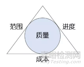 其次,研發(fā)人員應(yīng)該有質(zhì)量觀念。研發(fā)人員容易更注重進(jìn)度意識(shí),而忽略質(zhì)量意識(shí)。質(zhì)量管理是現(xiàn)代項(xiàng)目管理的一部分,按照項(xiàng)目管理體系的內(nèi)容,項(xiàng)目的質(zhì)量、進(jìn)度、范圍、成本是一個(gè)整體,關(guān)系圖如下: