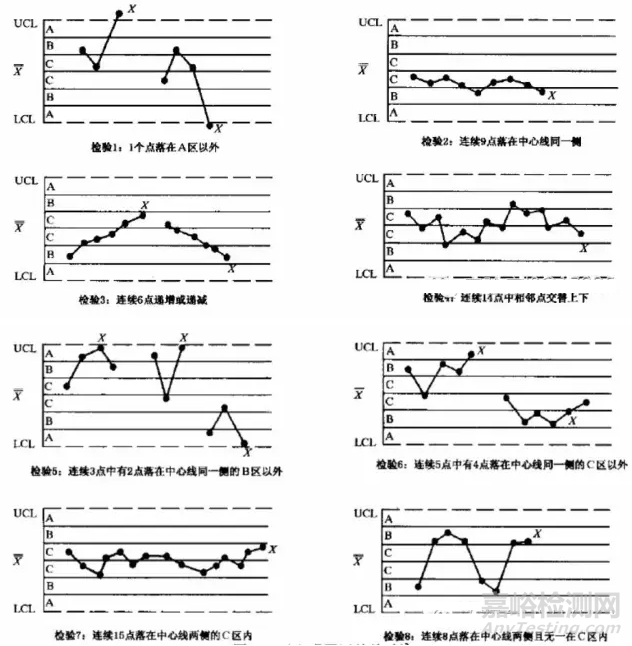 在日常工作中,如果控制值落在控制限之外,或觀察到在一個(gè)時(shí)間段內(nèi)控制值呈現(xiàn)一種特定的、系統(tǒng)性的變化模式時(shí),應(yīng)特別警惕。