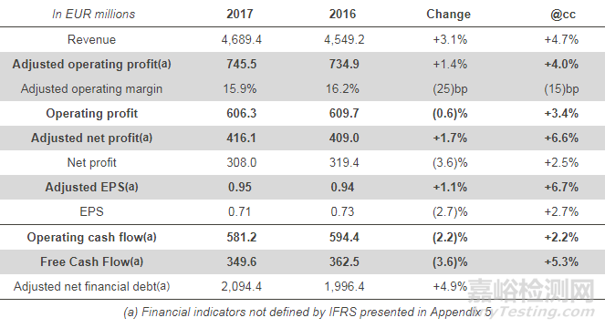 - 2017調(diào)整后營業(yè)利潤為7.46億歐元;調(diào)整后營業(yè)毛利率為15.9%; 有機(jī)毛利率16.1%
