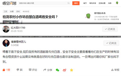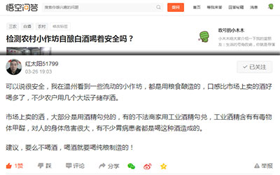 小作坊白酒本應(yīng)是小本經(jīng)營的,如果取得小作坊證并且正規(guī)生產(chǎn)的,百姓很愿意去相信“實(shí)惠”。食品檢測的小編在今日頭條的悟空問答等平臺對于小作坊白酒檢測喝著是否安全的調(diào)查中,百姓的聲音其實(shí)更傾向于“酒精勾兌”的問題。