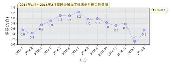 2015年1~2月,我國金屬加工機(jī)床進(jìn)口額為7.06億美元,同比減少44.9%;進(jìn)口量為6715.00臺,同比減少32.2%;進(jìn)口平均價格為10.52萬美元/臺,同比減少18.7%。